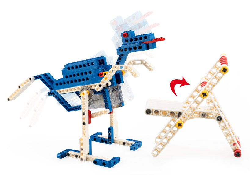 Construiește un motor și pornește-l cu ajutorul butonului de comandă pe baterii sau construiește un ciocan automat funcțional pentru o forjă, un dinozaur care se plimbă sau un scaun pliabil.